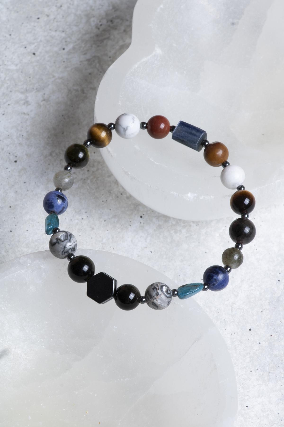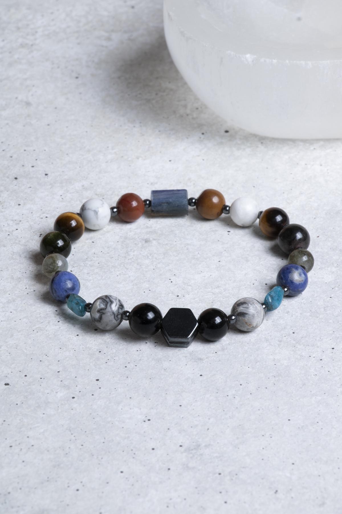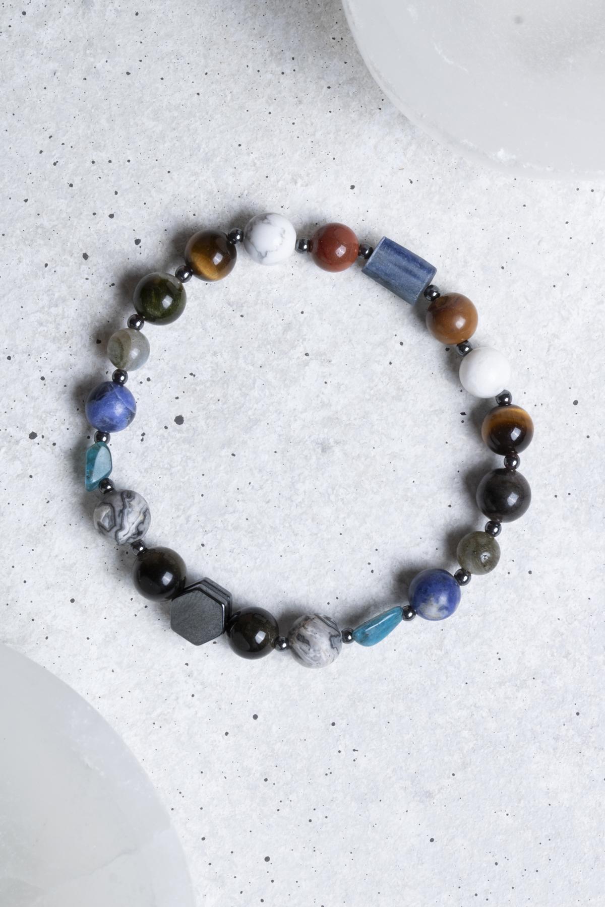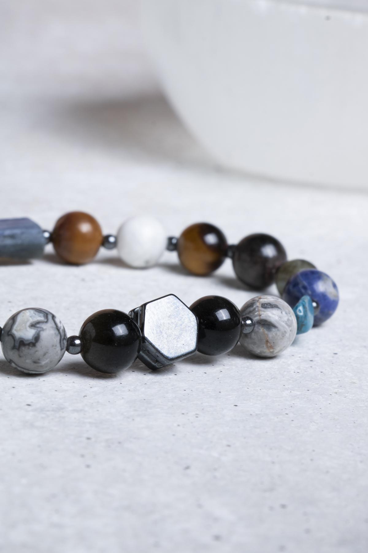 - Doğal Taşların Gücü: Bu bileklik, enerji dengeleyici özellikleriyle bilinen doğal taşlardan üretilmiştir. Kaplangözü, obsidyen, Jasper, Kyanit gibi taşlar, sakinleştirici ve rahatlatıcı etkileri ile ön plana çıkar.