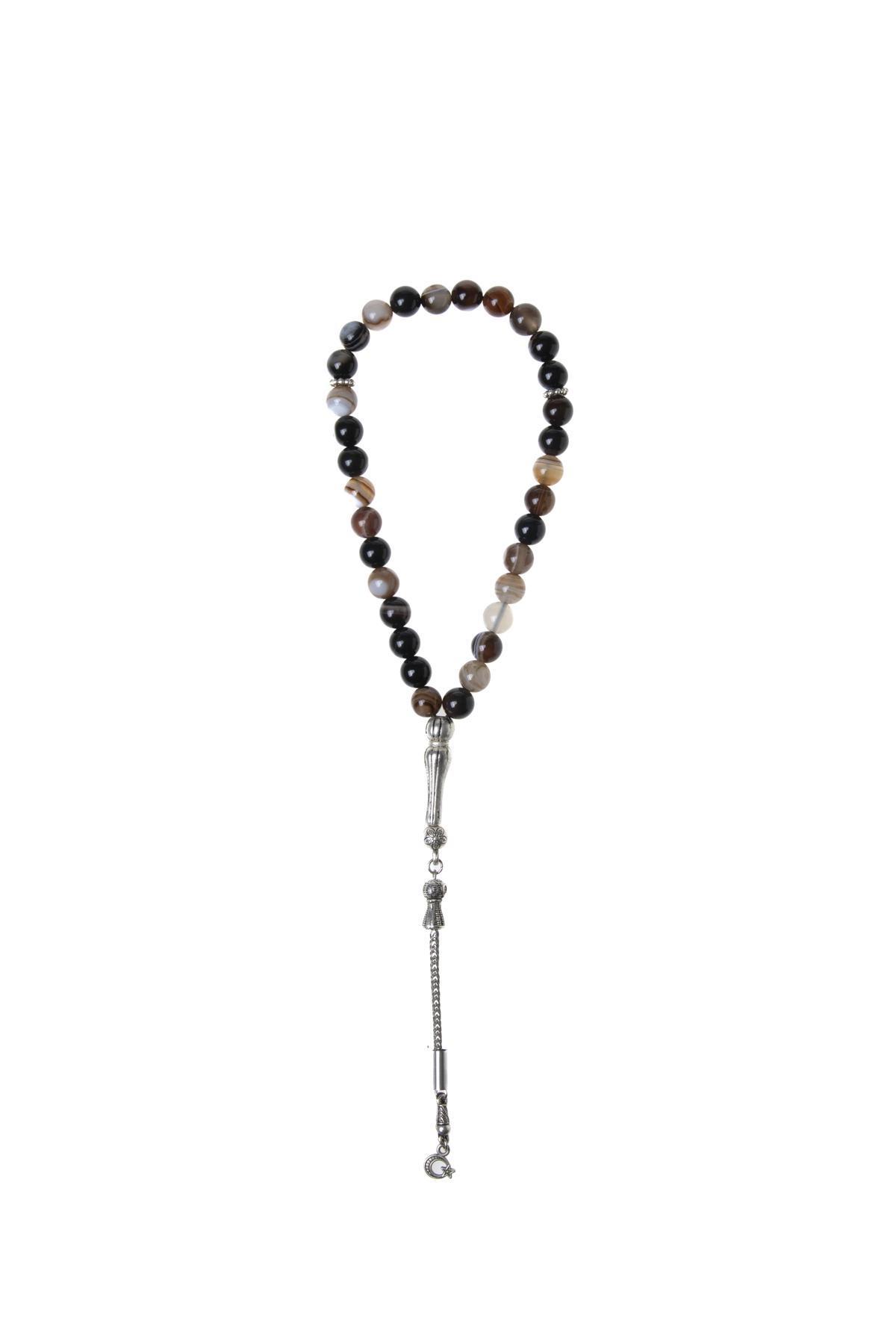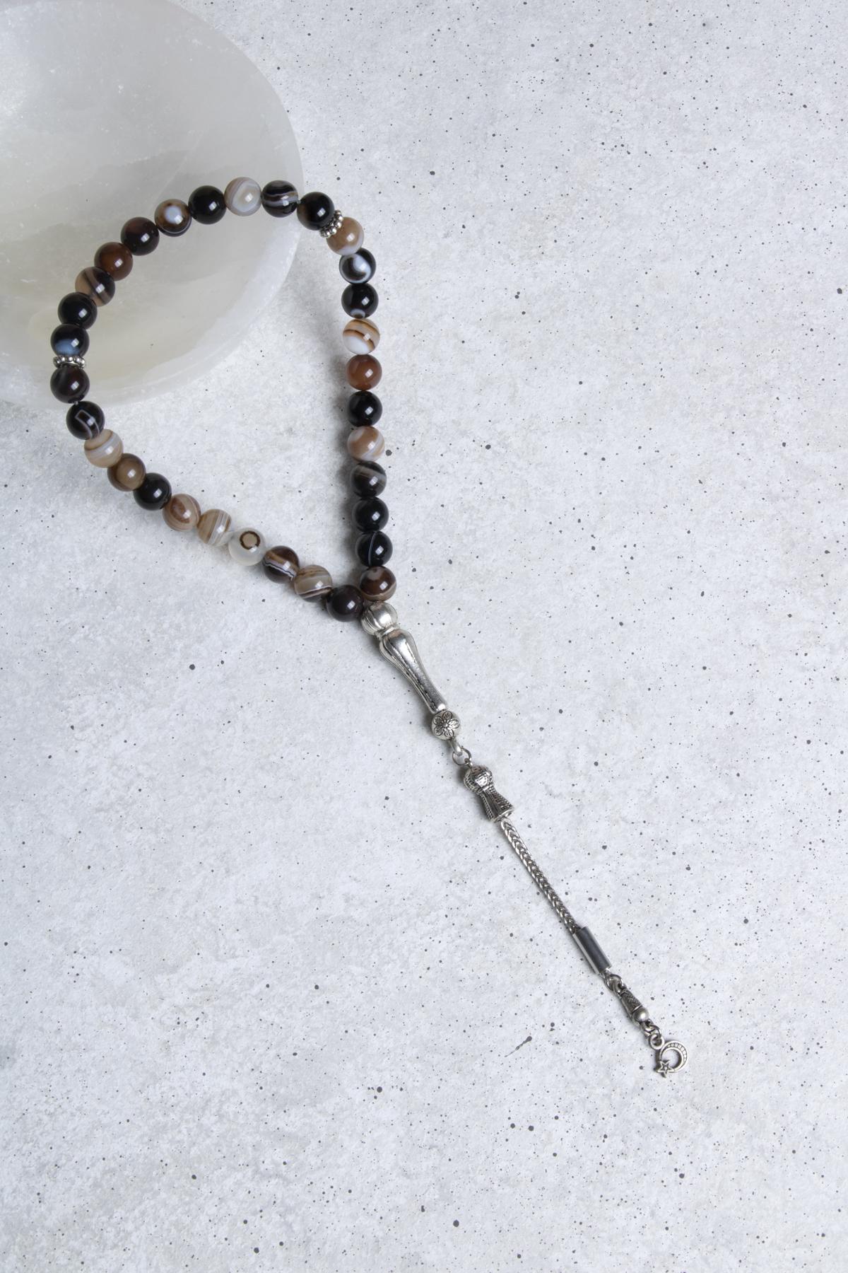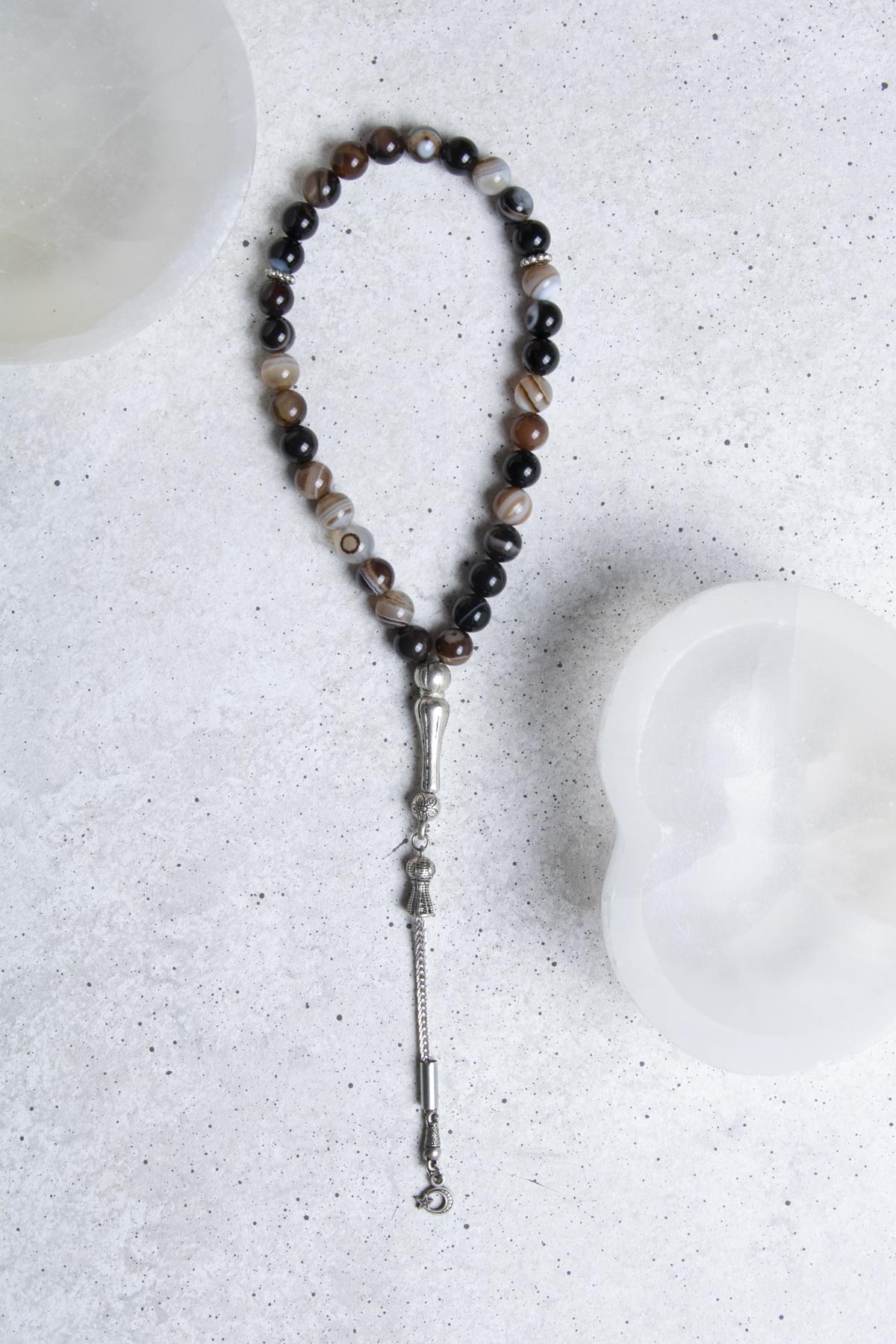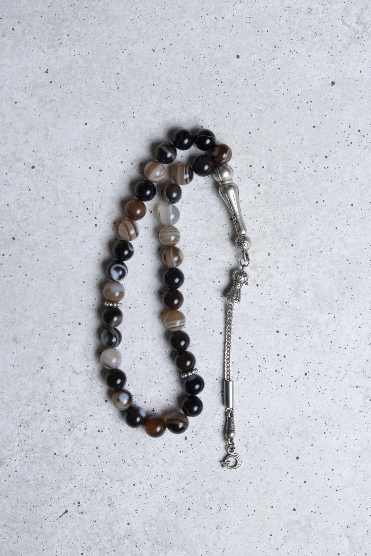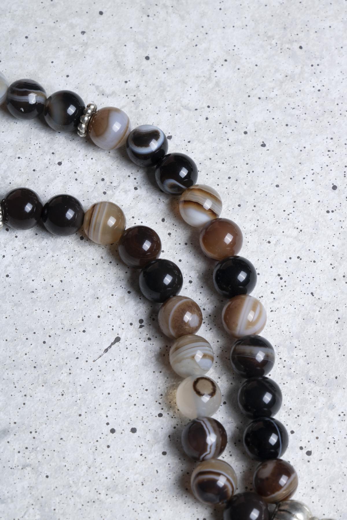Estetik tasarımıyla dikkat çeken bu tesbih, her ortamda şıklığınızı artıracak bir aksesuardır. Göz akik taşının doğal desenleri sayesinde her bir boncuk benzersizdir; bu sayede kullandıkça kendinizi özel hissedeceksiniz. Tesbih, el ile yoğrulmuş bir yapıya sahiptir ve elde rahatça tutularak kullanıma olanak tanır.
